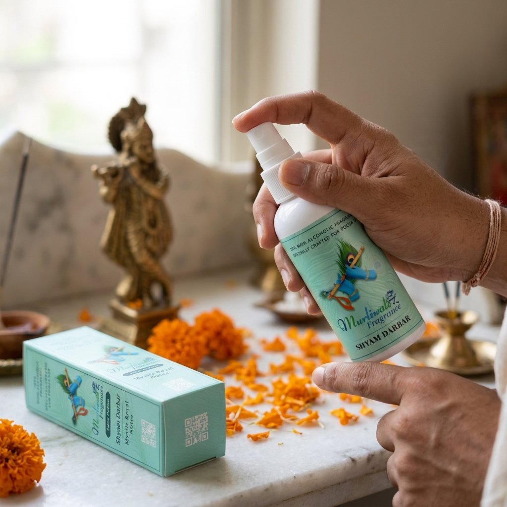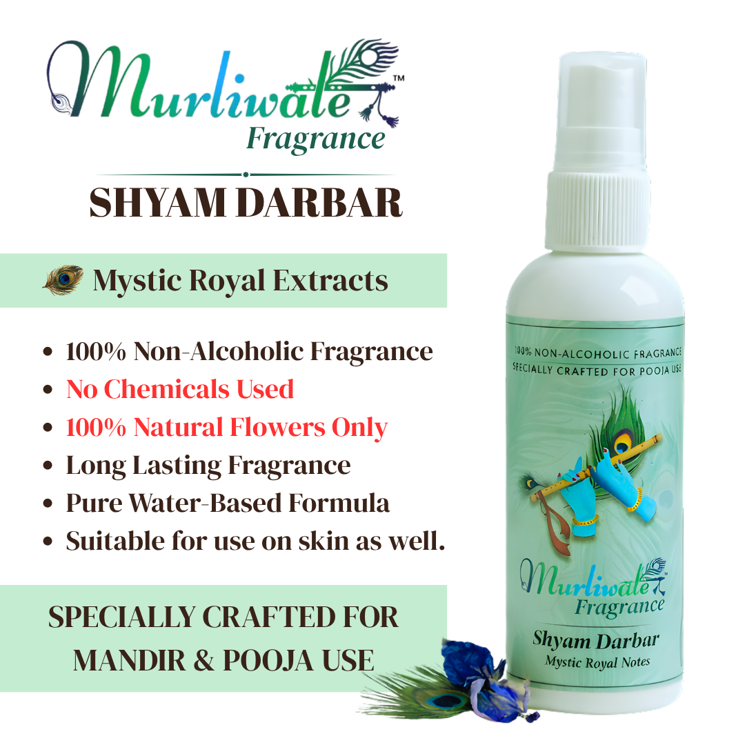 Murliwale Shyam Darbar Fragrance is a 100% non-alcoholic pooja spray crafted for daily worship. Pure rich, Mystic Royal scent that fills your mandir and prayer space with a sacred, lasting aroma. Ritually pure and safe near idols, flowers, and prasad.